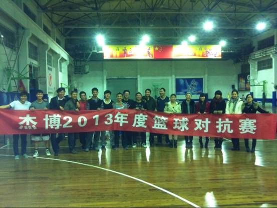 20131230日晚,由杰博育才事業(yè)部總經理應海峰組織的杰博公司籃球對抗賽“跨年之戰(zhàn)”在寧波東論球館進行,此次比賽匯集了上海、杭州、重慶、成都、中山以及寧波等各分公司的籃球愛好者。比賽中,精彩不斷,其樂融融,兄弟情誼融合得更加緊密。小伙子們精神抖擻,東風吹,戰(zhàn)鼓擂,這個世界誰怕誰;再看另一邊,“老夫”聊發(fā)少年狂,奔跑帝,籃板王。最后,比賽在輕松愉悅的氣氛中畫上了圓滿的句號。