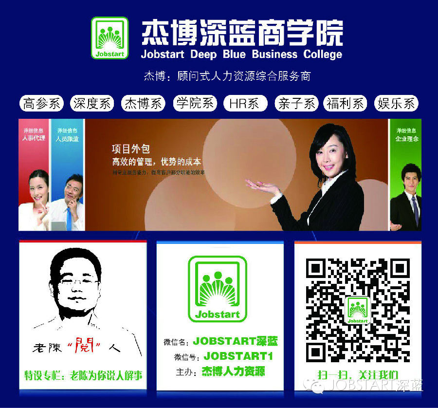 (說明:如果想及時(shí)了解杰博人力資源更新動(dòng)態(tài),除及時(shí)關(guān)注本網(wǎng)更新外,可添加杰博人力資源微信公號(hào)JOBSTART1,名稱JOBSTART深藍(lán),或者按下圖二維碼掃一掃即可)